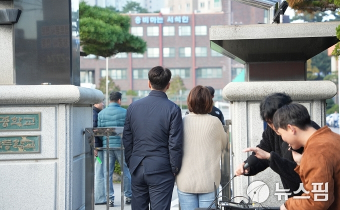 [광주=뉴스핌] 박진형 기자 = 2026학년도 대학수학능력시험이 시행된 13일 오전 광주 서석고등학교(광주시교육청 26지구 제21시험장) 교문 앞에서 한 학부모가 자녀를 배웅한 뒤 쉽사리 발걸음을 떼지 못하고 있다. 2025.11.13 bless4ya@newspim.com