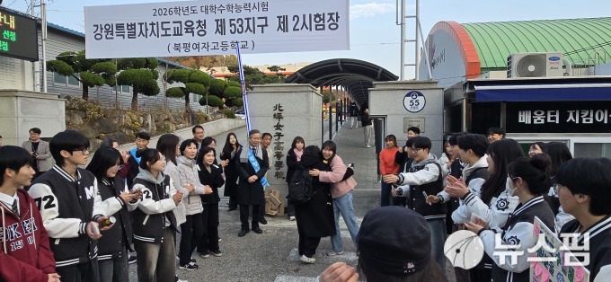 [동해=뉴스핌] 이형섭 기자 = 2026학년도 대학수학능력 시험이 치러지는 강원 동해시 북평여자고등학교 정문에서 김기하 강원도의원, 서순원 동해교육장, 신영선 동해시 경제산업국장, 천수정 동해시 체육교육과장을 비롯한 학교운영위원회 위원, 학원관계자 등이 고3 수험생들을 응원하고 있다.