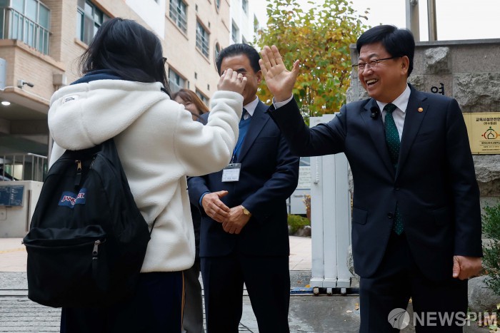 [서울=뉴스핌] 류기찬 기자 = 최교진 교육부 장관이 13일 오전 서울 영등포구 여의도여자고등학교에 마련된 시험장에 방문해 수험생들을 격려하고 있다. 2025.11.13 ryuchan0925@newspim.com