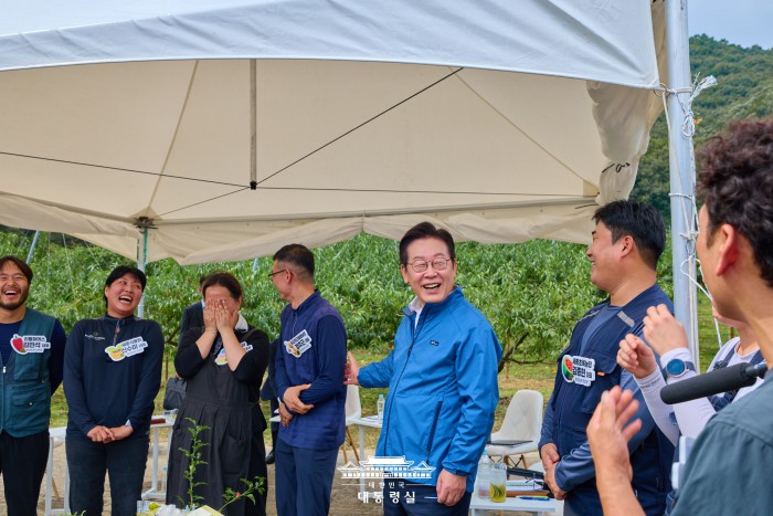 | [서울=뉴스핌] 이재명 대통령이 16일 세종시 전동면 조일농원에서 열린 청년 농업인 간담회에서 참석자과 대화를 나누고 있다. [사진=대통령실] 2025.09.16 photo@newspim.com |
