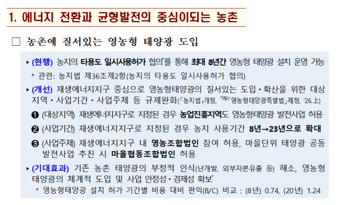 재생에너지 지구를 중심으로 영농형 태양광의 농지 사용기간을 현행 8년에서 최대 23년까지 연장하고, 영농조합법인 등 지역 주체의 참여를 확대한다.