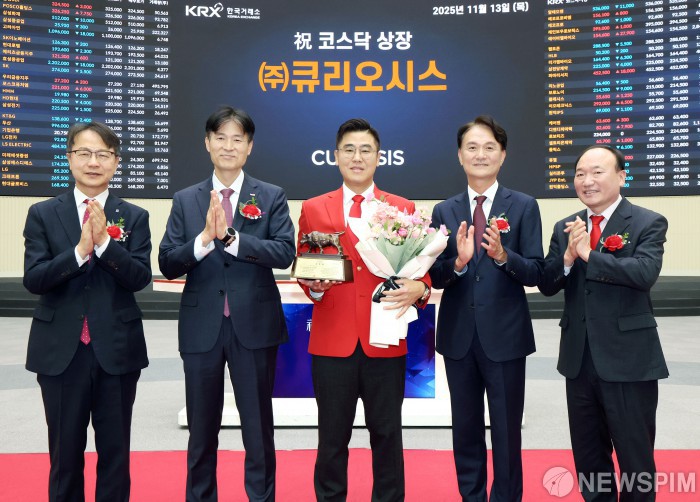 [서울=뉴스핌] 윤호영 큐리오시스 대표이사가 13일 서울 영등포구 한국거래소에서 열린 큐리오시스 코스닥시장 상장기념식에서 상장기념패 들고 기념촬영을 하고 있다. 왼쪽부터 김대영 한국IR협의회 부회장, 민경욱 한국거래소 코스닥시장본부장, 윤 대표이사, 엄주성 키움증권 대표이사, 강왕락 코스닥협회 부회장. [사진=한국거래소] 2025.11.13 photo@newspim.com