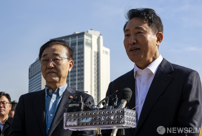 [서울=뉴스핌] 최지환 기자 = 오세훈 서울시장이 13일 서울 중구 달개비컨퍼런스에서 김윤덕 국토교통부 장관과 오찬을 마치고 취재진과 질의응답을 하고 있다. 2025.11.13 choipix16@newspim.com