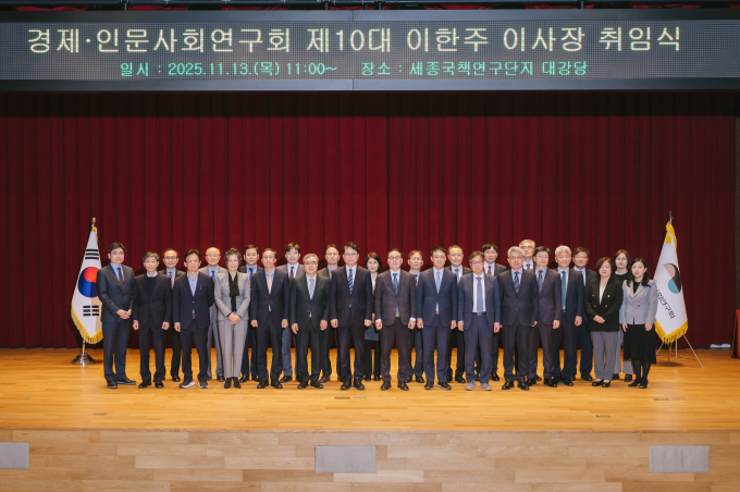| 이한주 경제·인문사회연구회 이사장이 13일 세종국책연구단지에서 취임식 기념사진을 찍고 있다. [사진=경제·인문사회연구회] 2025.11.13 sheep@newspim.com |