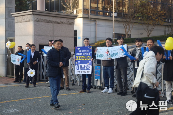 | 이남호 전 전북대 총장이 일행들과 함께 영생고 정문에서 수험생을 격려하고 있다.[사진=진짜배기 전북교육포럼]2025.11.13 lbs0964@newspim.com |