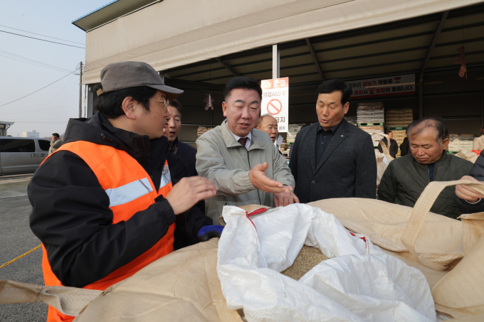 [청주=뉴스핌] 백운학 기자 = 이범석 청주시장은 13일 흥덕구 옥산면 오산리 옥산농협 경제사업장을 찾아 2025년산 공공비축미곡 수매 현황을 점검하고 농민들을 격려했다.