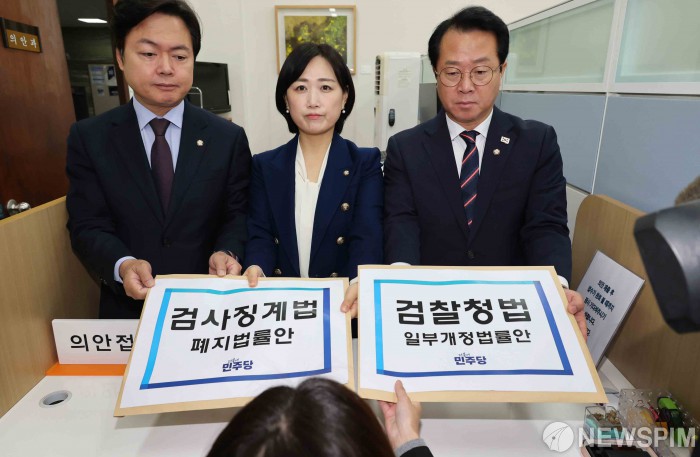 [서울=뉴스핌] 윤창빈 기자 = 더불어민주당 문금주•백승아•김현정 원내대변인(오른쪽부터)이 14일 국회 의안과에 검찰청법•검사징계법개정안을 제출하고 있다. 2025.11.14 pangbin@newspim.com