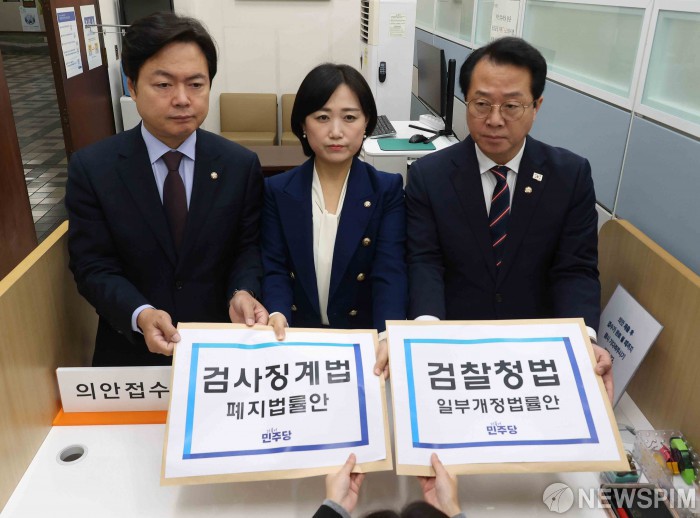 [서울=뉴스핌] 윤창빈 기자 = 더불어민주당 문금주•백승아•김현정 원내대변인(오른쪽부터)이 14일 국회 의안과에 검찰청법•검사징계법개정안을 제출하고 있다. 2025.11.14 pangbin@newspim.com