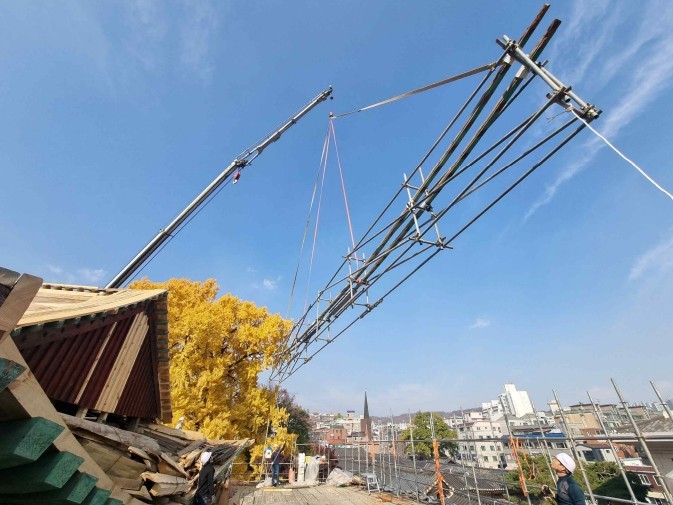 가설 비계 위에서 평고대를 내리는 모습. [사진=국가유산청]