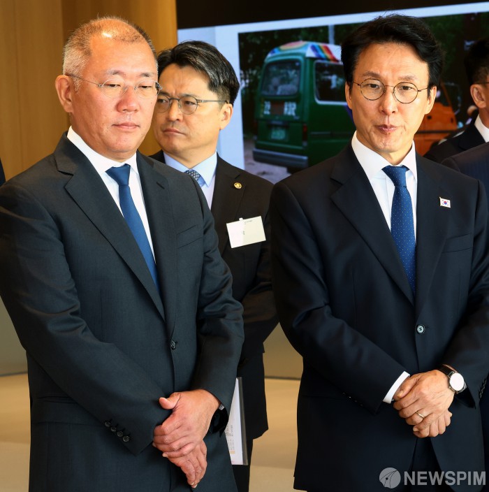 [화성=뉴스핌] 청사사진기자단 = 김민석 국무총리와 정의선 현대차그룹 회장이 14일 경기도 화성시 우정읍 기아오토랜드 화성 내 화성대에서 미래차 산업전략 대화 전 공장 전경 모형을 관람하고 있다. 2025.11.14 photo@newspim.com