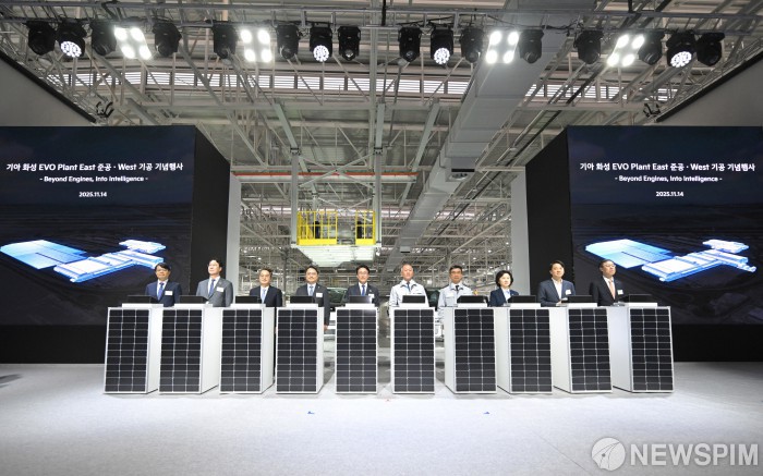 [화성=뉴스핌] 청사사진기자단 = 김민석 국무총리와 정의선 현대차그룹 회장을 비롯한 참석자들이 14일 오전 경기도 화성에서 열린 기아 화성 EVO 플랜트 East준공식 및 West기공식에서 세리머니에 앞서 기념촬영을 하고 있다. 왼쪽부터 문성준 현대차·기아협력회장, 정명근 화성시장, 김동연 경기도지사, 문신학 산업통상부 1차관, 김 총리, 정 회장, 송호성 기아 사장, 송옥주 더불어민주당 의원, 이준석 개혁신당 대표, 정정훈 한국자산관리공사 사장. 2025.11.14 photo@newspim.com