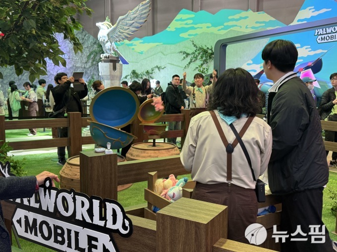 부스는 팰월드의 세계관을 모티브로 한 테마파크형 공간으로 꾸며져 어린 자녀와 함께 부스를 찾는 가족 단위 관람객도 많이 볼 수 있었다. 직원들도 놀이공원 유니폼을 연상케 하는 복장을 하고 관람객들에게 게임 속 인기 생명체(팰) '까부냥' 인형 탈과 사진을 찍을 수 있다고 안내했다.
