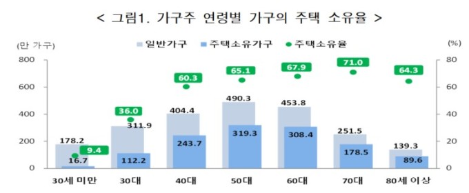한편 가구주 연령대별 주택 소유율은 70대(71.0%)가 가장 높았고, 60대(67.9%), 50대(65.1%) 순으로 높았다. 30세 미만(9.4%)은 가장 낮았다.