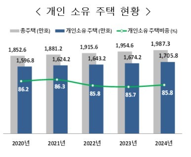 총 주택 1987만호 중 개인이 소유한 주택은 1705만호(85.8%), 주택 소유자는 1597만6000명으로 전년대비 35만7000명(2.3%) 늘었다.