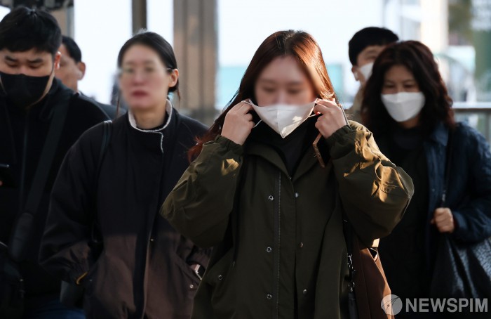 | [서울=뉴스핌] 최지환 기자 = 서울 최저 기온이 1도까지 떨어지며 한파주의보가 발령된 3일 오전 서울 서초구 교대역 앞에서 시민들이 발걸음을 서두르고 있다. 2025.11.03 choipix16@newspim.com |