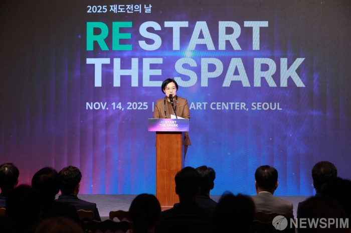 [서울=뉴스핌] 한성숙 중소벤처기업부 장관이 14일 서울 강남구 라움아트센터에서 열린 2025 재도전의 날에서 축사를 하고 있다. [사진=중소벤처기업부] 2025.11.14 photo@newspim.com