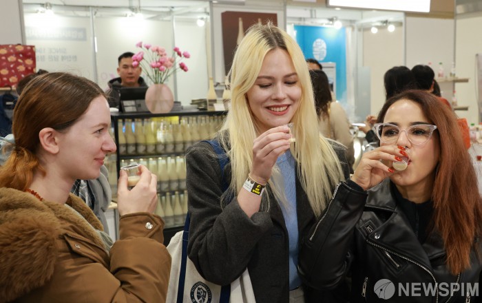 [서울=뉴스핌] 김학선 기자 = 14일 서울 양재동 aT센터에서 열린 '2025 대한민국 우리술 대축제'를 찾은 외국인들이 술을 시음하고 있다. 올해로 15회째를 맞는 우리술 대축제는 매년 2만여 명이 찾는 대표적인 우리술 행사다. 2025.11.14 yooksa@newspim.com
