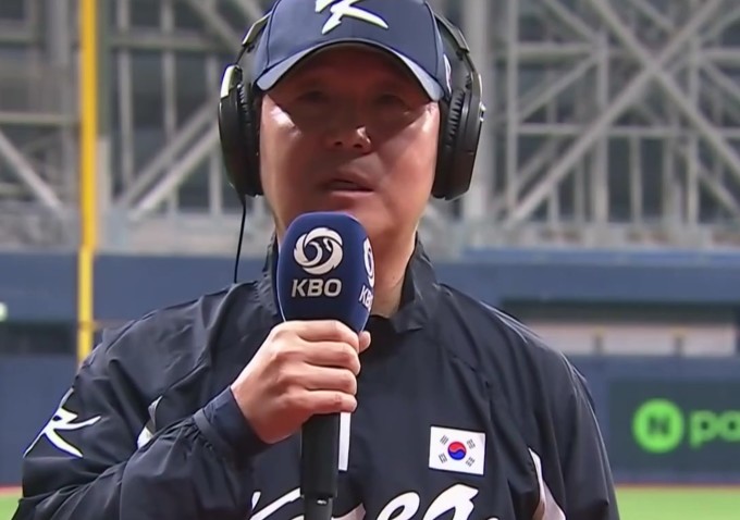 | 지난 9일 체코전을 앞두고 인터뷰에 응하는 류진현 한국야구대표팀 감독. [사진=SBS 중계화면 캡처] |