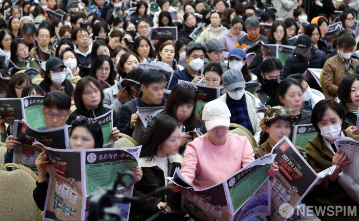 [서울=뉴스핌] 최지환 기자 = 14일 오후 서울 광진구에서 열린 종로학원 2026학년도 정시 합격점수 예측 및 전략 설명회에서 학부모 및 수험생들이 배치표를 살펴보고 있다. 2025.11.14 choipix16@newspim.com
