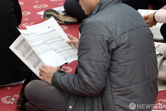 [서울=뉴스핌] 최지환 기자 = 14일 오후 서울 광진구에서 열린 종로학원 2026학년도 정시 합격점수 예측 및 전략 설명회에서 학부모 및 수험생들이 배치표를 살펴보고 있다. 2025.11.14 choipix16@newspim.com