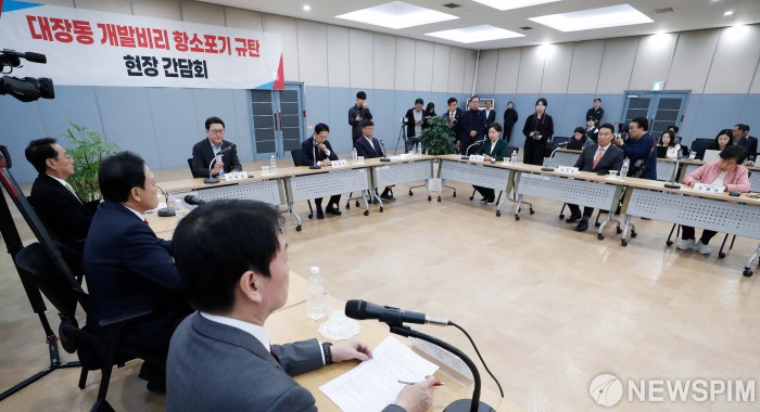 [성남=뉴스핌] 류기찬 기자 = 장동혁 국민의힘 대표와 국민의힘 의원들이 14일 오후 경기 성남시 분당구 성남도시개발공사에서 열린 ‘대장동 개발비리 항소포기 규탄 현장 간담회’에 참석하고 있다. 2025.11.14 ryuchan0925@newspim.com