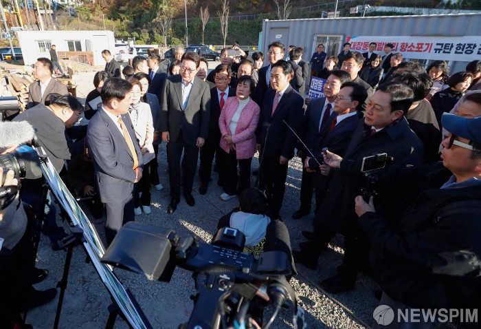 [성남=뉴스핌] 류기찬 기자 = 장동혁 국민의힘 대표가 14일 오후 경기 성남시 분당구 대장동 사회기반시설 건설현장에 방문해 현장을 살펴보고 있다. 2025.11.14 ryuchan0925@newspim.com