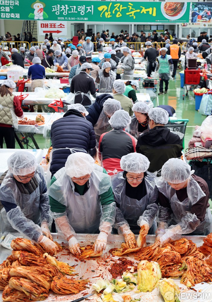 [서울=뉴스핌] 양윤모 기자 = 14일 강원 평창군 진부면민체육공원에서 개막한 '제8회 평창고랭지김장축제'를 찾은 방문객들이 김장을 담그고 있다. 평창산 고랭지 배추를 비롯해 모든 식재료를 국내산으로 사용하는 평창고랭지김장축제는16일까지 진행한다. [사진=평창군청] 2025.11.14 yym58@newspim.com
