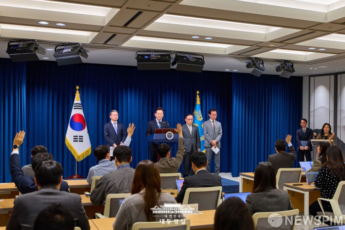 [서울=뉴스핌] 이재명 대통령이 14일 서울 용산 대통령실에서 한·미 팩트시트 타결 결과 발표를 마치고 취재진의 질문을 받고 있다. [사진=대통령실] 2025.11.14 photo@newspim.com