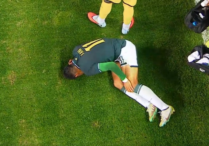 | 이강인에 의해 태클을 당한 볼리비아선수가 그라운드에 쓰러져있다. [사진=쿠팡플레이 중계화면 캡처] |