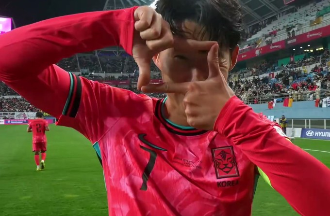 | 손흥민이 14일 볼리비아전에서 프리킥으로 골을 넣고 '찰칵 세리머니'를 하고 있다. [사진=쿠팡플레이 중계화면 캡처] |