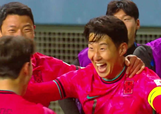 | 손흥민이 14일 볼리비아전에서 프리킥으로 골을 넣고 기뻐하고 있다. [사진=쿠팡플레이 중계화면 캡처] |