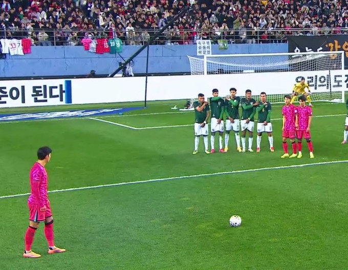 | 손흥민이 14일 볼리비아전에서 프리킥을 준비하고 있다. [사진=쿠팡플레이 중계화면 캡처] |