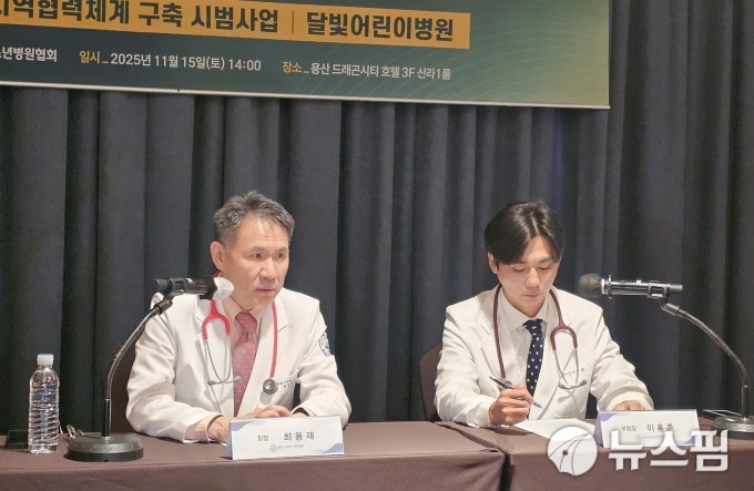 | [서울=뉴스핌] 조준경 기자 = 15일 대한소아청소년병원협회가 '달빛ㅇ린이병원 기능중심 전환'을 촉구하는 기자회견을 서울 용산 드래곤시티호텔에서 진행했다. (왼쪽부터) 최용재 협회장, 이홍준 부회장. 2025.11.15 calebcao@newspim.com |