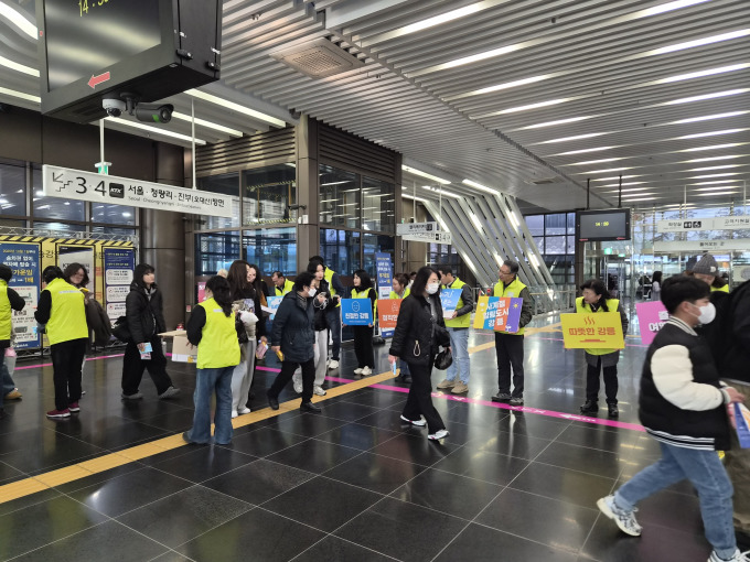 | 강릉역 관광객 환영 캠페인.[사진=강릉시] 2025.11.16 onemoregive@newspim.com |