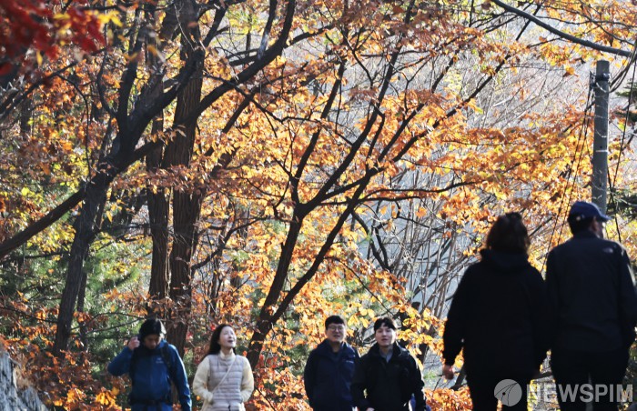 [서울=뉴스핌] 양윤모 기자 = 휴일인 16일 서울 북한산국립공원을 찾은 시민들이 아쉬운 가을의 끝자락에 붉게 피어난 단풍을 즐기고 있다. 2025.11.16 yym58@newspim.com