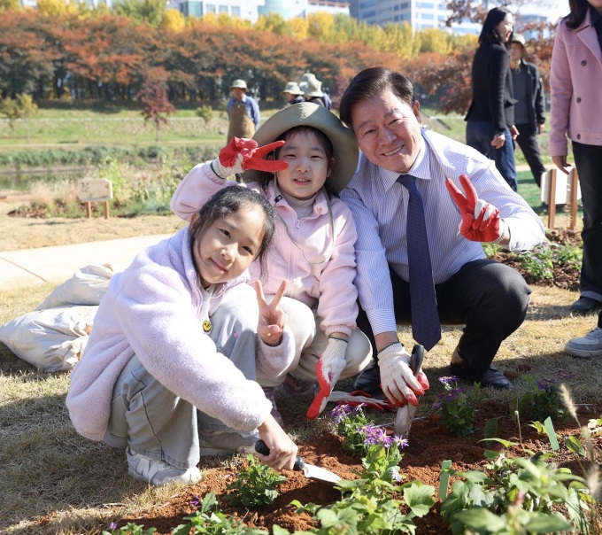 | 박승원 광명시장이 지난 15일 안양천 지방정원 시범구간에서 개최한 '정원 어울림 한마당'에 참석해 아이들과 시민참여정원을 가꾸고 있다. [사진=광명시] |