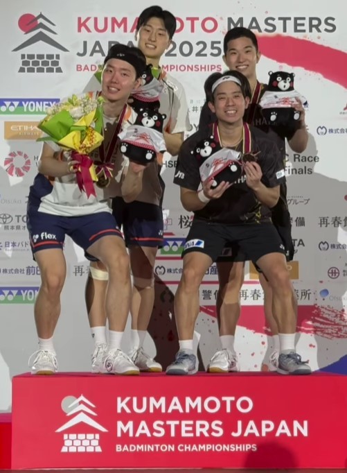 | 김원호(뒷줄 왼쪽)-서승재는 16일(한국시간) BWF 월드투어 슈퍼 500 일본 마스터스 남자복식 시상식에서 준우승에 그친 일본의 미도리카와 히로키-야마시타 교헤이와 함께 포즈를 취하고 있다. [사진=BWF 동영상 캡처] |
