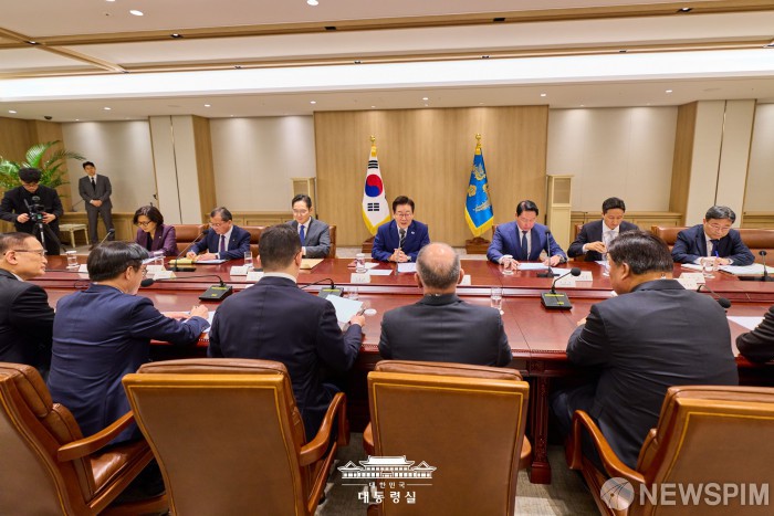 [서울=뉴스핌] 이재명 대통령이 16일 서울 용산 대통령실에서 열린 한미 관세협상 후속 민관 합동회의에서 발언하고 있다. [사진=대통령실] 2025.11.16 photo@newspim.com