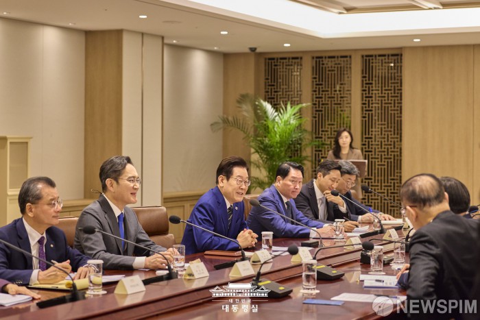 [서울=뉴스핌] 이재명 대통령이 16일 서울 용산 대통령실에서 열린 한미 관세협상 후속 민관 합동회의에서 발언하고 있다. [사진=대통령실] 2025.11.16 photo@newspim.com