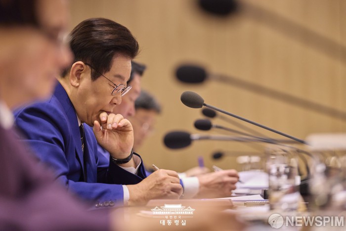 [서울=뉴스핌] 이재명 대통령이 16일 서울 용산 대통령실에서 열린 한미 관세협상 후속 민관 합동회의에서 생각에 잠겨 있다. [사진=대통령실] 2025.11.16 photo@newspim.com
