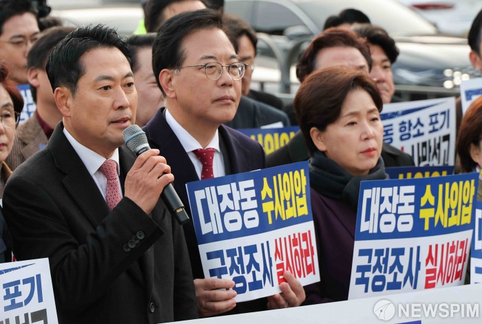 [서울=뉴스핌] 윤창빈 기자 = 장동혁 국민의힘 대표가 17일 서울 용산구 전쟁기념관 앞에서 열린 대장동 항소포기 외압 진상규명을 위한 국정조사 촉구 기자회견에서 규탄사를 하고 있다. 2025.11.17 pangbin@newspim.com