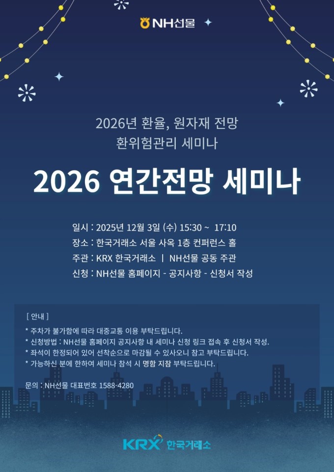 NH선물 관계자는 "2026년은 금리·환율·원자재 등 주요 시장 변수들이 동시에 변동성을 높일 수 있는 환경"이라며 "이번 세미나를 통해 고객들이 내년도 경영 전략과 환리스크 관리에 실질적 도움을 얻기를 바란다"고 말했다.