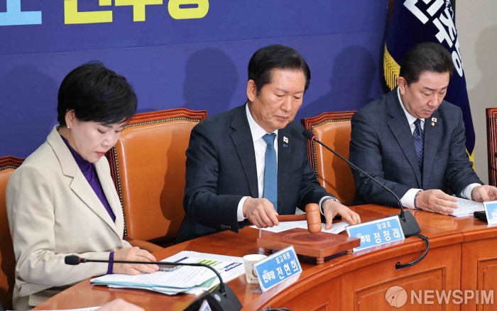 [서울=뉴스핌] 윤창빈 기자 = 정청래 더불어민주당 대표가 17일 오전 서울 여의도 국회에서 열린 최고위원회의에서 의사봉을 두드리고 있다. 2025.11.17 pangbin@newspim.com