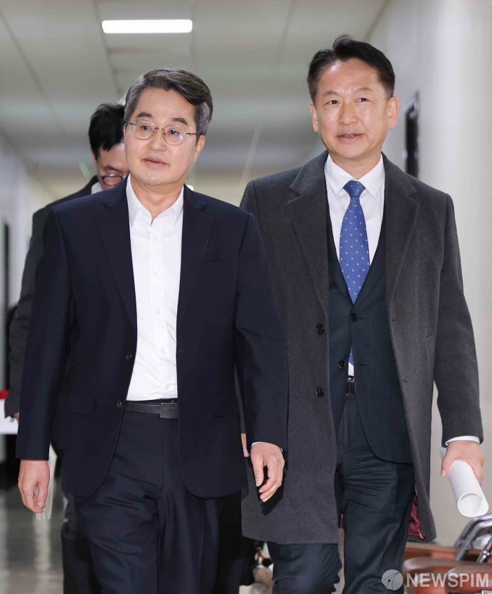 영서울=뉴스핌] 윤창빈 기자 = 김동연 경기도지사, 고영인 경제부지사가 17일 서울 여의도 국회에서 한병도 국회 예산결산특별위원장과 내년도 경기도 주요 국비사업과 관련한 면담을 하기 위해 들어서고 있다. 2025.11.17 pangbin@newspim.com