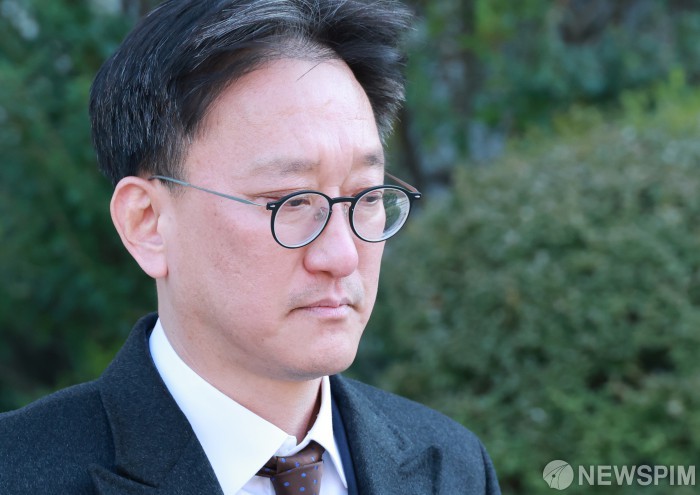 [서울=뉴스핌] 김학선 기자 = 채상병 순직 사건 수사를 방해한 혐의를 받는 송창진 전 공수처 부장검사가 17일 구속 전 피의자 심문(영장실질심사)를 마치고 서울 서초구 서울중앙지법을 나서고 있다. 2025.11.17 yooksa@newspim.com