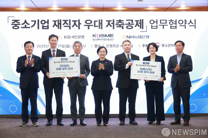[서울=뉴스핌] 한성숙 중소벤처기업부 장관이 17일 서울 중구 은행회관에서 열린 중소기업 재직자 우대 저축공제 업무협약식에서 참석자들과 기념촬영을 하고 있다. [사진=중소벤처기업부] 2025.11.17 photo@newspim.com