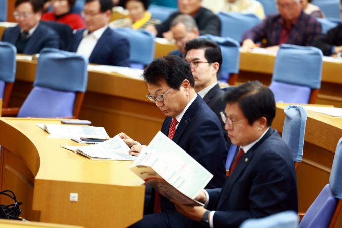 | 17일 국회 세미나실에서 열린 '남북 10축(영덕~울진~삼척) 고속도로 건설 정책토론회'에서 박형수 국회의원(오른쪽), 손병복 울진군수(가운데)가 토론회 자료집을 보며 발제에 귀기울이고 있다.[사진=박형수의원실]2025.11.17 nulcheon@newspim.com |
