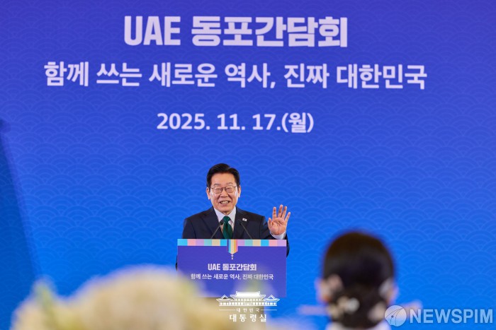 [서울=뉴스핌] 박찬제 기자 = 이재명 대통령이 17일(현지 시간) 저녁 아랍에미리트(UAE)에서 현지 동포들과 만나 "앞으로 더 자긍심을 갖고 자랑할 만한 조국으로 대한민국이 변하게 될 것"이라고 약속했다.