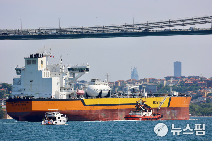| 러시아 국기를 단 로스네프트 소속 원유 운반선 블라디미르 모노마흐호가 2023년 7월 6일 튀르키예 이스탄불의 보스포루스 해협을 항해하고 있다. [사진=로이터 뉴스핌] |