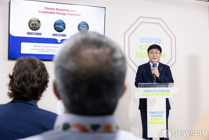 [서울=뉴스핌] 김성환 기후에너지환경부 장관이 17일(현지시간) 브라질 벨렝에서 열린 제30차 유엔기후변화협약당사국총회(COP30) 부대행사로 한국에너지공단이 주관한 기후·청정에너지 포럼에 참석해 기조연설을 하고 있다. [사진=기후에너지환경부] 2025.11.18 photo@newspim.com